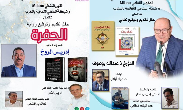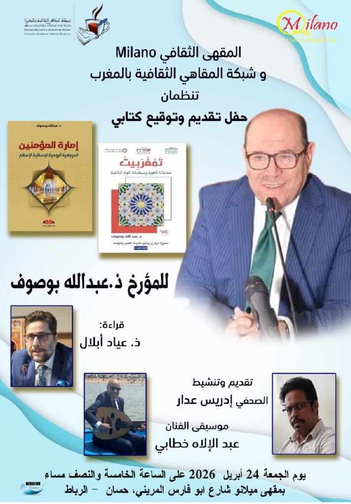 تنطلق أولى هذه اللقاءات يوم الجمعة 24 أبريل 2026، حيث يحتضن مقهى ميلانو بالعاصمة حفل تقديم وتوقيع كتابي “تمغربيت” و*“إمارة المؤمنين”* للمؤرخ عبد الله بوصوف، الأمين العام لمجلس الجالية المغربية بالخارج، في لقاء يقدمه وينشطه الصحفي إدريس عدار، ويشارك فيه الأستاذ عياد أبلال بقراءة نقدية في العملين، مع إضفاء لمسة فنية من خلال مشاركة موسيقية للفنان عبد الإله خطابي.