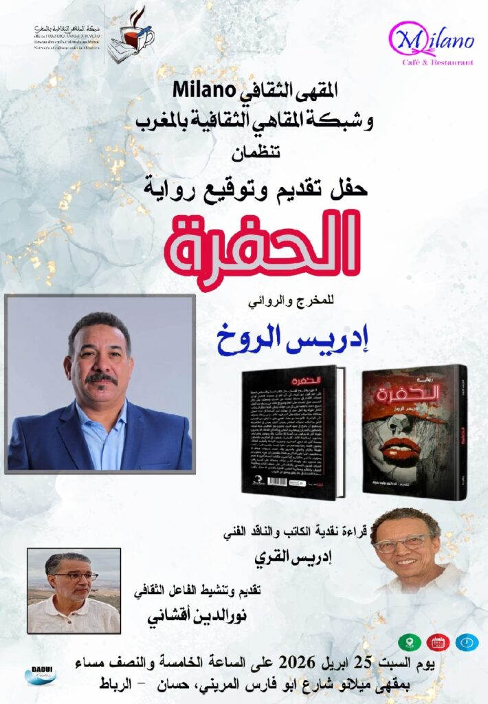 أما الموعد الثاني، فسيكون يوم السبت 25 أبريل 2026، في نفس الفضاء الثقافي، حيث سيُقام حفل تقديم وتوقيع رواية “الحفرة” للمخرج والروائي إدريس الروخ، بمشاركة الكاتب والناقد الفني إدريس القري الذي سيقدم قراءة نقدية في العمل، فيما يتولى الفاعل الثقافي نور الدين أقشاني مهمة التقديم والتنشيط.