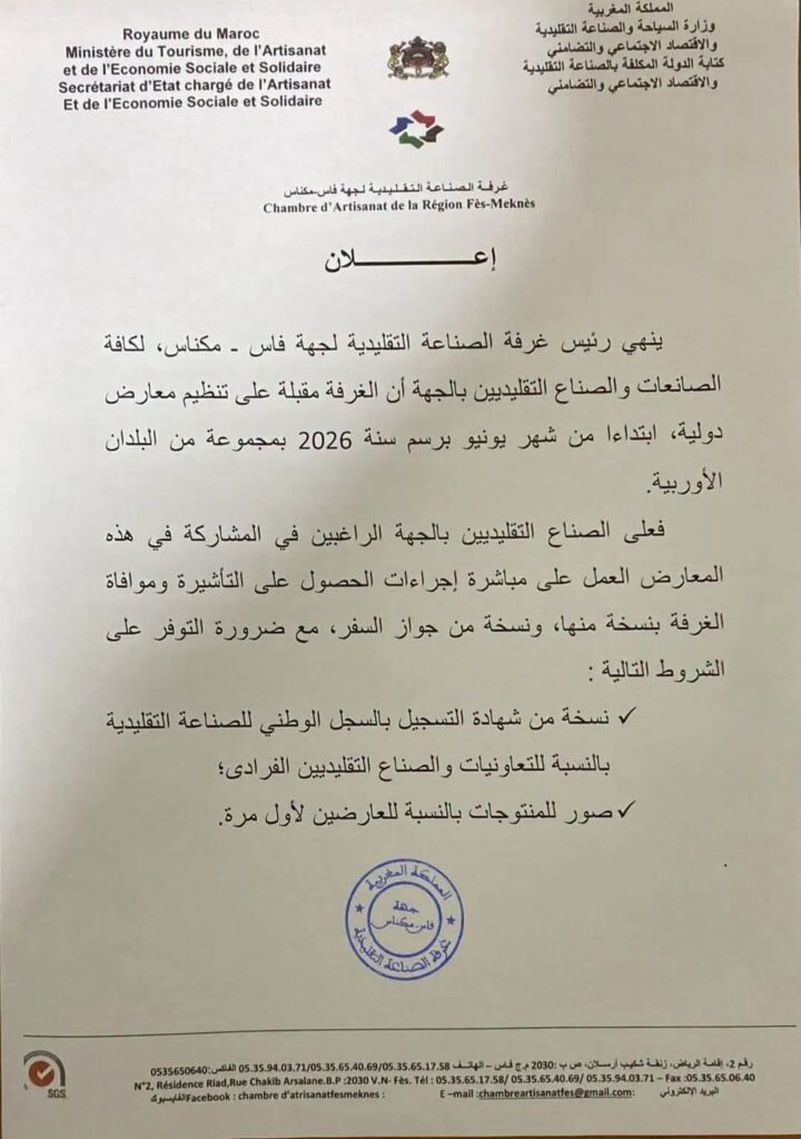 غرفة الصناعة التقليدية بجهة فاس-مكناس تعلن عن معارض دولية لفائدة الصناع التقليديين ابتداءً من يونيو 2026