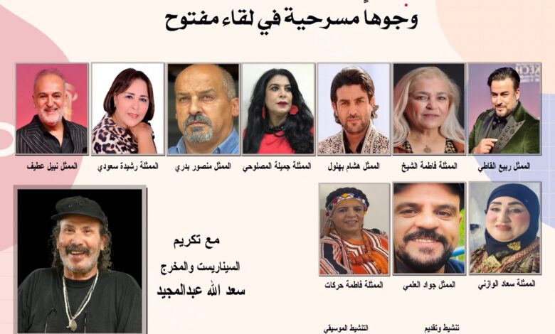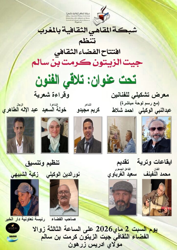 السبت 2 ماي 2026 : لقاء مفتوحا لوجوه فنية بالدار البيضاء ، بتنسيق مع جمعية سيني كافي للثقافة والفنون، بحضور الفنانون ربيع القاطي و فاطمة الشيخ و هشام بهلول وجميلة المصلوحي ومنصور بدري ورشيدة سعودي ،ونبيل عاطف ، وسعاد الوزاني ،وجواد العلمي، وفاطمة حركات ، مع تكريم السيناريست والمخرج سعد الله عبدالمجيد.