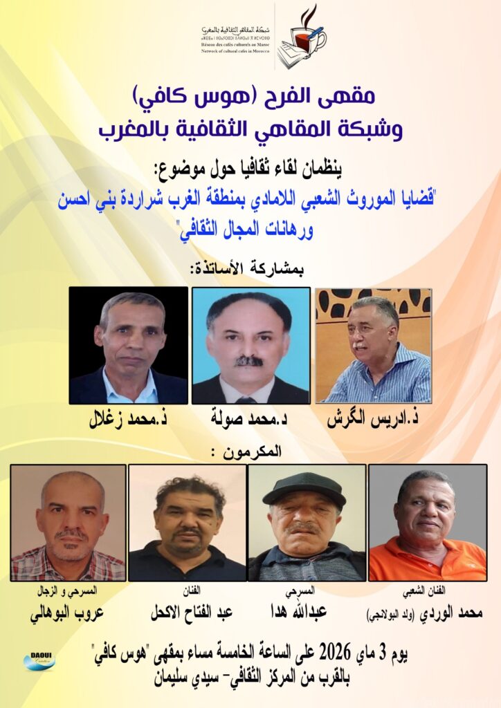 كما تنظم الشبكة لقاء ثقافيا حول موضوع “قضايا الموروث الشعبي اللامادي بمنطقة الغرب شراردة بني احسن ورهانات المجال الثقافي ” ، بمشاركة الأساتذة :ادريس الكرش ومحمد صولة ومحمد زغلال ، وذلك يوم الأحد 3 ماي على الساعة الخامسة مساء بمقهى هوس كافي (الفرح ) بالقرب من المركز الثقافي بسيدي سليمان .