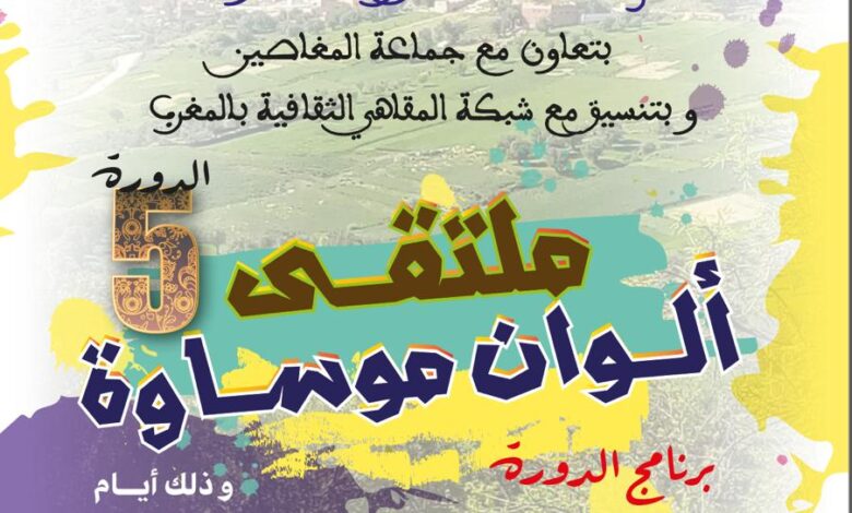 حت شعار “تثمين الموارد الطبيعية والبشرية رهان التنمية المحلية”، انطلقت مساء الخميس، 26 يونيو، فعاليات النسخة الخامسة لملتقى ألوان موساوة بجماعة المغاصين. تنظم الملتقى جمعية الصخور للثقافة والتنمية بالتعاون مع جماعة المغاصين، وبتنسيق مع شبكة المقاهي الثقافية بالمغرب.