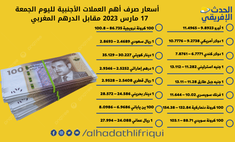 أهم أسعار صرف العملات الأجنبية مقابل الدرهم، لليوم الجمعة 17 مارس 2023، حسب بنك المغرب: