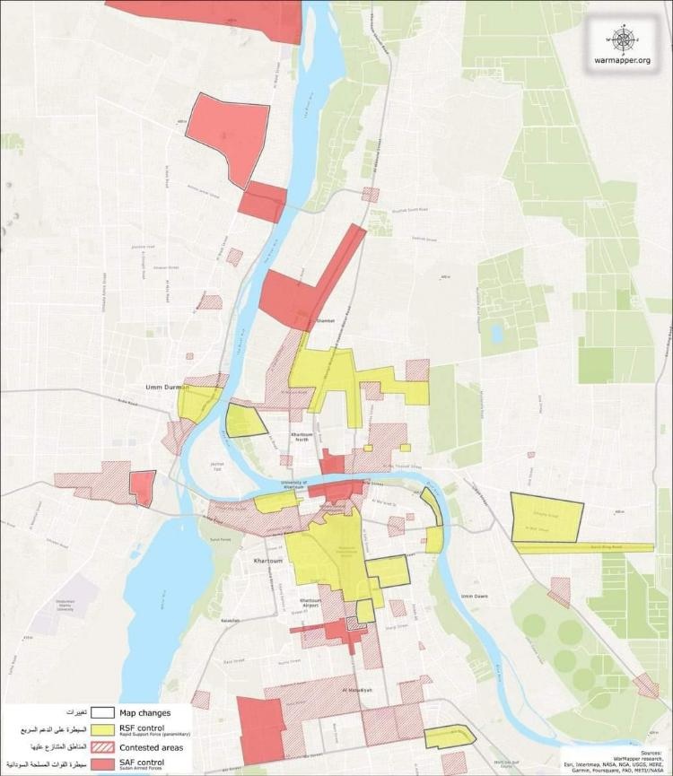 نشر موقع متخصص في الرصد الجغرافي خريطة توضح مناطق سيطرة الدعم السريع والقوات المسلحة الميدانية في مدن العاصمة الخرطوم.