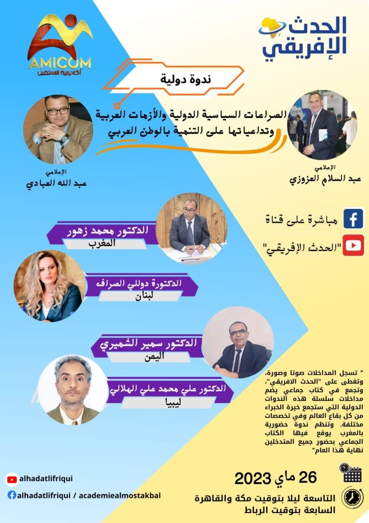 ناقش باحثون وخبراء في الندوة الثانية من سلسلة الندوات التي تنظمها “الحدث الافريقي” و”أكاديمية المستقبل”، أمس الجمعة 26ماي الجاري، قضايا الأمة العربية والاشكالات التي تؤرق صانع القرار في الوطن العربي جراء مخلفات التصدعات والحروب المشتعلة في بعض الدول العربية، وتطرق أيضا نفس المتدخلين في هذه الندوة التي أدارها الإعلاميين عبدالله العبادي وعبدالسلام العزوزي، إلى الحرب الروسية الأوكرانية وتداعياتها على التنمية في الوطن العربي.