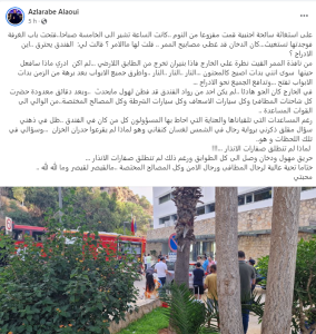 و أضاف : “في الخارج كان الجو هادئا ..لم يكن احد من رواد الفندق قد فطن لهول مايحدث ..وبعد دقائق معدودة حضرت كل شاحنات المطافئ وكل سيارات الاسعاف وكل سيارات الشرطة وكل المصالح المختصة..من الوالي الى القوات المساعدة ..رغم المساعدات التى تلقياناها والعناية التي احاط بها المسؤولون كل من كان في الفندق ..ظل في ذهني سؤال مقلق ذكرني برواية رجال في الشمس لغسان كنفاني وهو لماذا لم يقرعوا جدران الخزان …وسؤالي في تلك اللحظات و هو..لماذا لم تنطلق صفارات الانذار …!!!حريق مهول ودخان وصل الى كل الطوابق ورغم ذلك لم تنطلق صفارات الانذار .. تحية عالية لرجال المطافى ورجال الامن وكل المصالح المختصة ..مالقيصر لقيصر وما لله لله”.