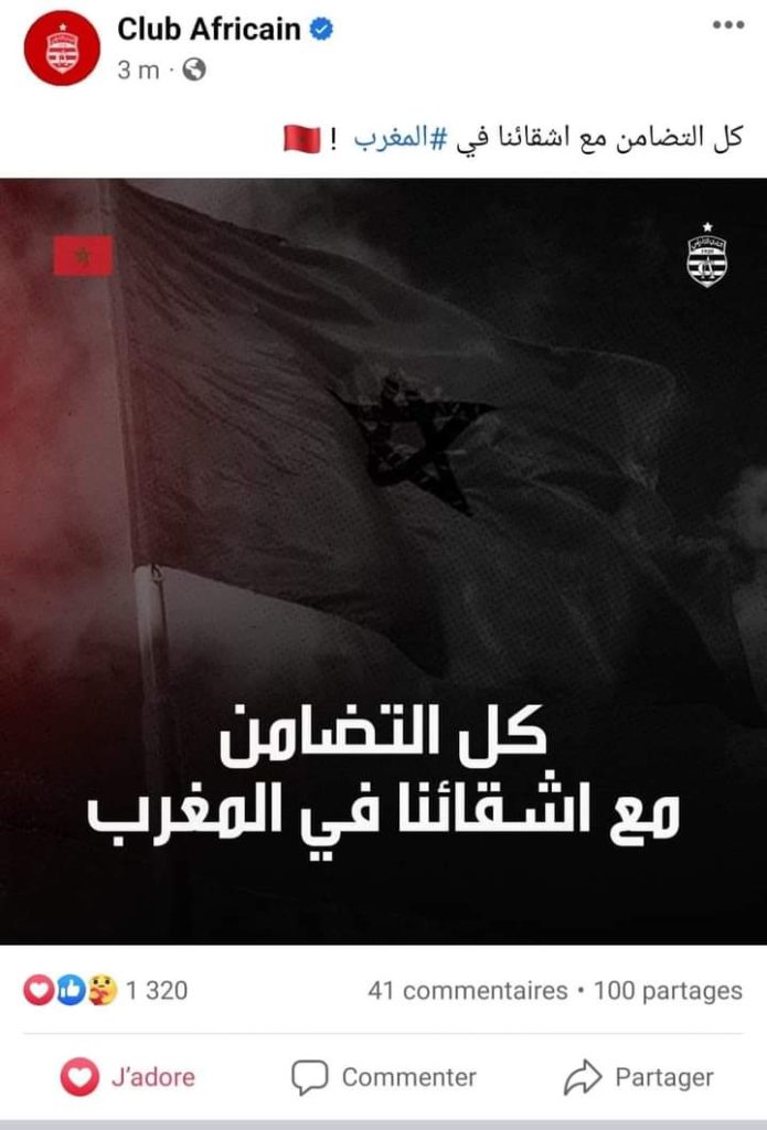 نشر النادي الافريقي التونسي لكرة القدم، على صفحته بالفيسبوك تغريدة، يتضامن فيها مع الشعب المغربي إثر الزلزال الذي ضرب منطقة الحوز ليلة الجمعة السبت؛ قائلا “كل التضامن مع اشقائنا في المغرب “.