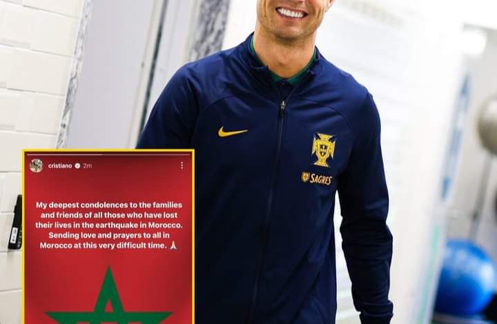 نشر كريستيانو رونالدو عبر ستوري IG منشورا يقدم فيه التعازي لأهل وأسر ضحايا زلزال الحوز قائلا : ” أتقدم بأحر التعازي لأسر وأصدقاء جميع الذين فقدوا أرواحهم في الزلزال الذي ضرب المغرب. أرسل حبي وصلاواتي للجميع في المغرب في هذا الوقت العصيب للغاية “.