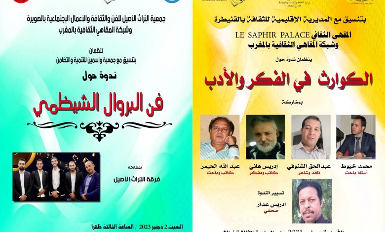 الأحد 3 دجنبر : ندوة ” الكوارث في الفكر والأدب ” بمشاركة الأساتذة محمد خيوط ،عبد الحق الشنوفي ، ادريس هاني و عبدالله الحيمر ، وتسيير الصحفي ادريس عدار إبتداء من الساعة الثالثة زوالا بالمركز الثقافي بالقنيطرة .