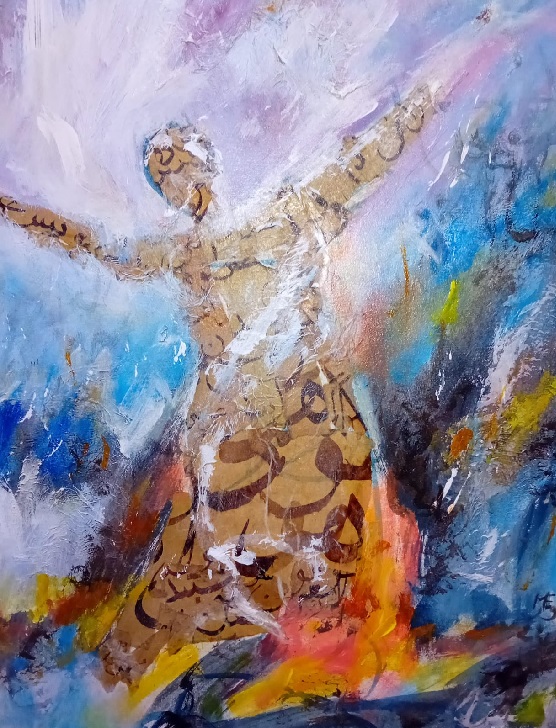 حروف كلمات ممزقة فملصقة، ضوء المادة ولونها حسب طبقات عجينية ملطخة تتجزأ وتتقاطع ويعاد تركيبها حسب متطلبات موضوع اللوحة إلى أن تصبح المحاور الحقيقي مع المتلقي بعدما كانت غائبة طيلة عهود مضت، إنه يجردها من مفهومها وينذرها للفراغ ولروعتها الجسمانية والحرف أحيانا يتحول إلى كلمة ذات بعد صوفي وأحيانا أخرى لا يبقى غير شبح الحرف، كما لاو أنه خط شخصي يأخذ شكله في مجهولية جسده وأحيانا يتحول الشبح ذاك بشكل راديكالي إلى انبساط التعاريف ليأخذ شكل رق يحاكي الكتابة ودعوى إلى انمحائها الأصلي.