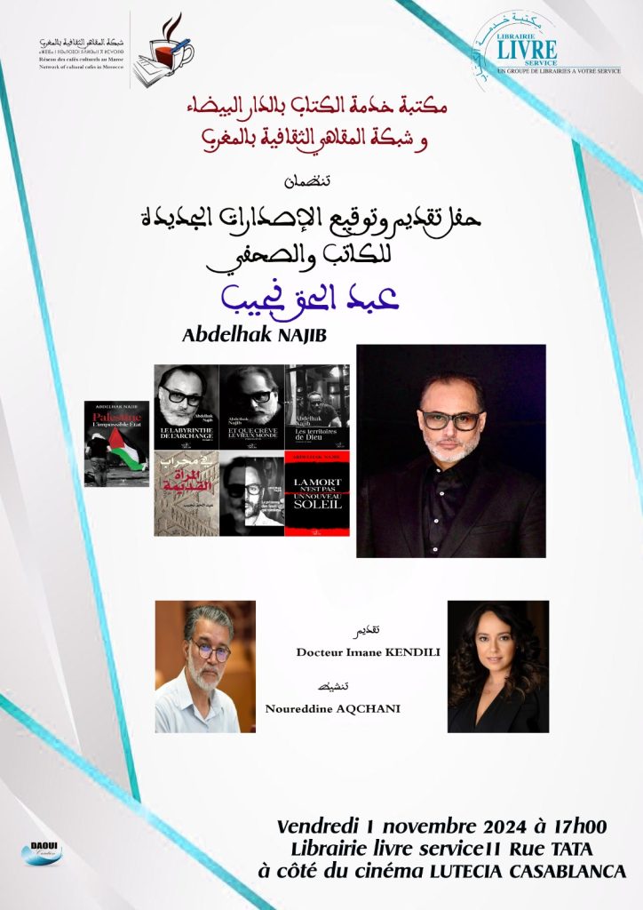 حفل تقديم وتوقيع الإصدارات الجديدة للكاتب والصحفي عبدالحق نجيب بمكتبة livre service زنقة طاطا بجوار سينما ليتسيا بالدار البيضاء على الساعة الخامسة مساء .