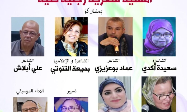 أمسية شعرية زجلية فنية بمشاركة سعيدة أكدي وعماد بوعزيزي و بديعة التنوتي وعلي أبلاش ونبيلة المصباحي ووسيمة أكدي .هذا السمر الليلي الرمضاني ،المنظم مع جمعية أضواء تطوان للثقافة والفن ، تقدمه الزجالة والشاعرة حفيظة أعراس ، وينشطه موسيقيا الفنان عبدالنور منصورةعلى الساعة التاسعة والنصف ليلا بمقهى “سوريانو ” أمام قصر الندى طريق مارتيل بتطوان .