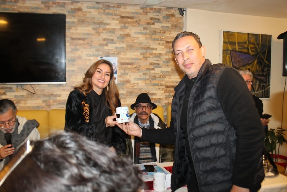 و بعد ذلك تناول الكلمة نور الدين أقشاني رئيس شبكة المقاهي الثقافية بالمغرب، الذي رحب بالضيفة ، ومنوها بالمسار الفني المتميز لها ،وقام بتقديم جرد لأنشطة المقاهي الثقافية الموزعة عبر ربوع المملكة الذي تجاوز 200 لقاء منذ التأسيس، إستضافت فيه الشبكة أسماء وازنة من عالم الفكر و الأدب والفن والسياسة ،دون نسيان تقديم الشكر للسيد عزيز صاحب المقهى على ركوبه المغامرة الثقافية مع الشبكة.