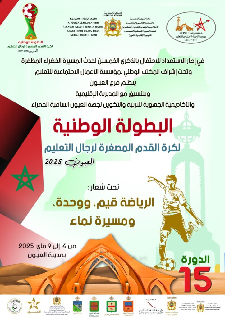 تحتضن مدينة العيون فعاليات الدورة 15 للبطولة الوطنية لكرة القدم المصغرة لرجال التعليم، التي سينظمها الفرع الإقليمي لمؤسسة الأعمال الاجتماعية للتعليم بالعيون من 4 إلى 9 ماي الجاري، في إطار احتفالات الشعب المغربي المخلدة للذكرى الخمسين لانطلاق المسيرة الخضراء المظفرة.