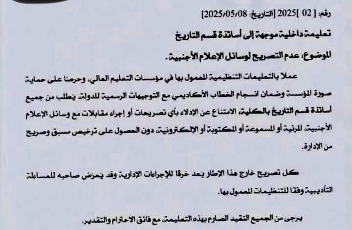 وفي خضم هذا الجو الخانق، تصدر وثيقة “جامعة الشلف”، لتأمر أساتذة قسم التاريخ بعدم التصريح لأي وسيلة إعلام أجنبية دون ترخيص مسبق. وكأن الأستاذ الجامعي موظف في ثكنة عسكرية، لا حامل رسالة معرفية.