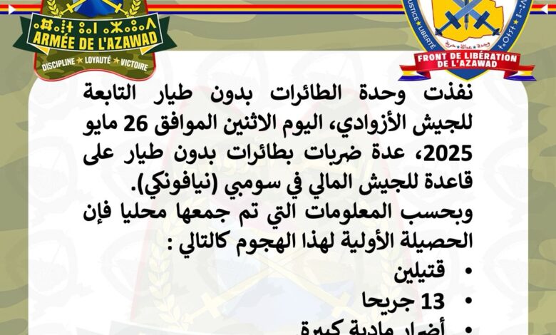 أعلنت جبهة تحرير أزواد عن تنفيذ هجمات استهدفت الجيش المالي باستخدام طائرات بدون طيار، مؤكدة أنها أسفرت عن مقتل جنديين وإصابة 13 آخرين بجراح.