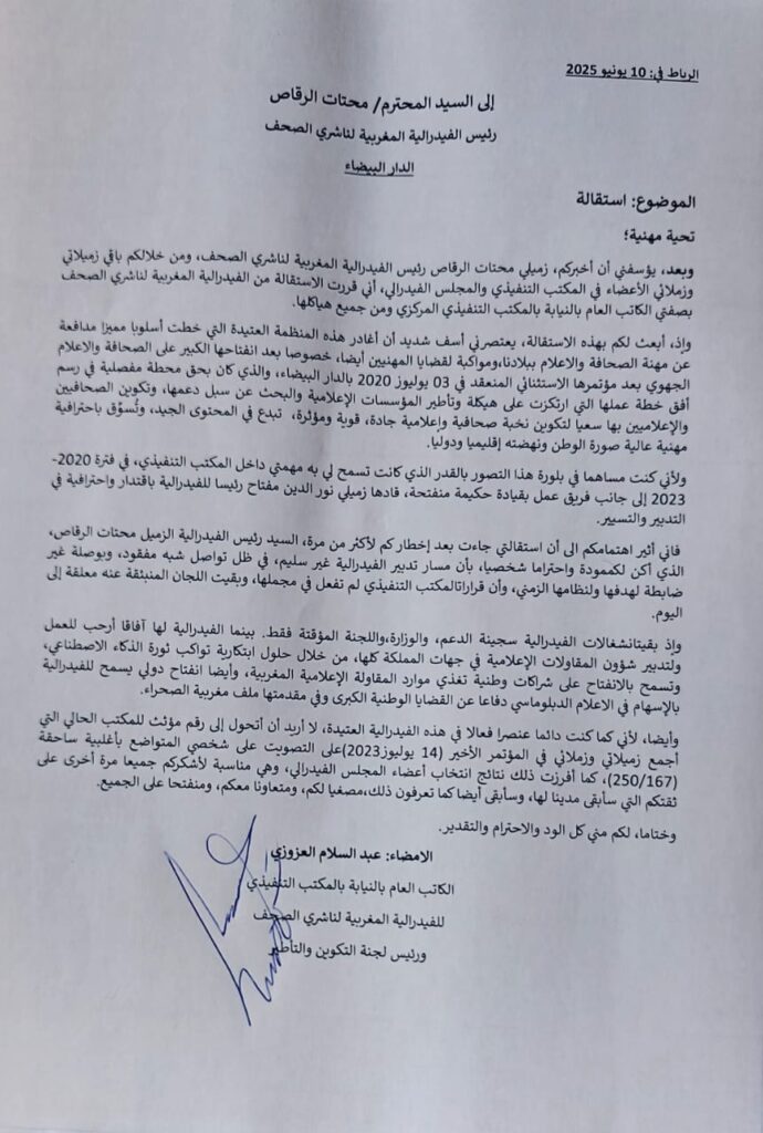 قدم الاعلامي عبد السلام العزوزي، الكاتب العام بالنيابة للمكتب التنفيذي للفيدرالية المغربية لناشري الصحف ورئيس لجنة التكوين والتأطير، استقالته من جميع هياكل الفيدرالية، بعث بها إلى رئيس الفيدرالية السيد محتات الرقاص.