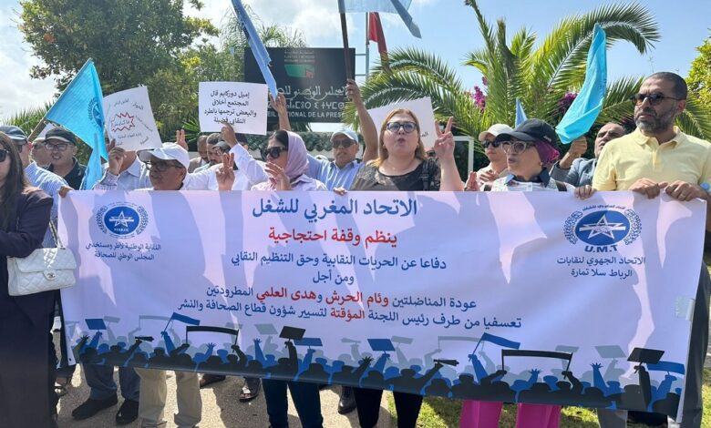 نظّم الاتحاد الجهوي لنقابات الرباط سلا تمارة والنقابة الوطنية لأطر ومستخدمي المجلس الوطني للصحافة، المنضوية تحت لواء الجامعة الوطنية للصحافة والإعلام والاتصال، اليوم الأربعاء 11 يونيو 2025، وقفة احتجاجية ناجحة وقوية أمام مقر المجلس الوطني للصحافة، رفضًا للطرد التعسفي الذي طال الزميلتين المناضلتين وئام الحرش وهدى العلمي، ومطالبة بعودتهما الفورية إلى عملهما.