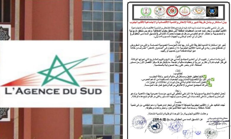 دعت ست هيئات مدنية وحقوقية إلى فتح تحقيق عاجل ومستقل في مالية وتدبير وكالة الجنوب، والعمل على نشر اللوائح التفصيلية للمشاريع والجمعيات المستفيدة من الدعم العمومي، مع العمل على تفعيل المساءلة القانونية في حال ثبوت أي اختلالات أو تجاوزات، مؤكدة على ضرورة إشراك المجتمع المدني والإعلام في مراقبة وتتبع عمل هذه المؤسسة.