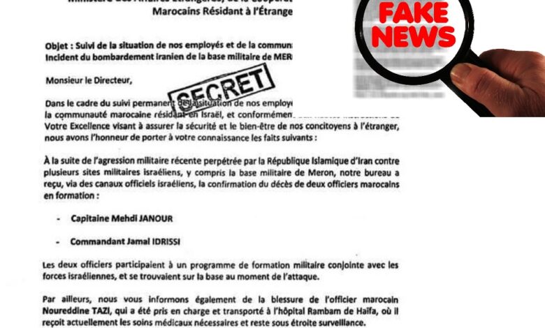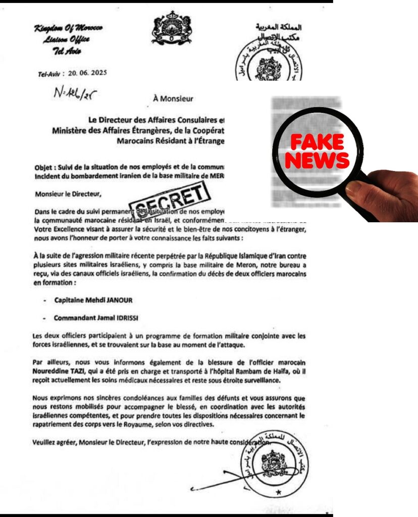 تداولت وسائل التواصل الاجتماعي ما قيل إنه “وثيقة رسمية سرية” صادرة عن مكتب الاتصال المغربي في تل أبيب، تزعم وقوع ضباط مغاربة قتلى وجرحى في قصف إيراني استهدف قاعدة عسكرية إسرائيلية.