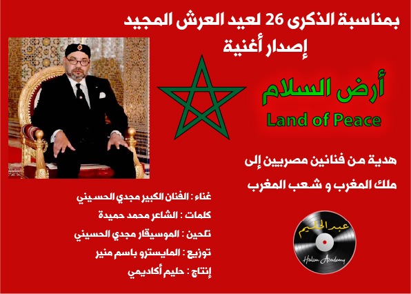 أعلنت ” أكاديمية حليم” بالمغرب، عن إنتاج أغنية جديدة تحت عنوان: أرض السلام، وهي” إهداء من شاعر وملحن مصريين” بمناسبة الذكرى السادسة والعشرون لتربع الملك محمد السادس على عرش أسلافه المنعمين