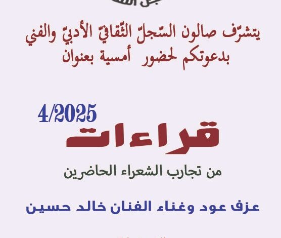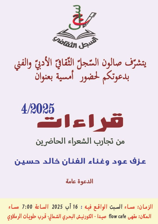 ينظم صالون السجل الثقافي الأدبي والفني قراءات شعرية لشعراء محليين ،مع عزف وغناء الفنان خالد حسين ، وذلك يوم السبت 16 ٱب/غشت 2025 ،بمقهى flow الكورنيش البحري الشمالي صيدا بلبنان .