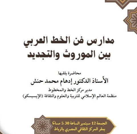 في خطوة لتعزيز التبادل الثقافي، ينظم المركز الثقافي المصري بالرباط بالتعاون مع مركز الخط والمخطوط التابع لمنظمة العالم الإسلامي للتربية والعلوم والثقافة (إيسيسكو)، محاضرة بعنوان “مدارس فن الخط العربي بين الموروث والتجديد”.