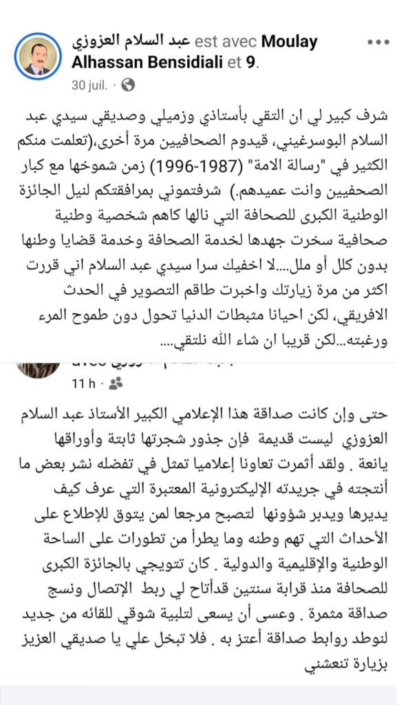 هذا الصباح صدمت لفراقه قبل لقائه وهو الذي خصني برفقته خلال حفل تكريمه بالجائزة الوطنية الكبرى للصحافة بالرباط.