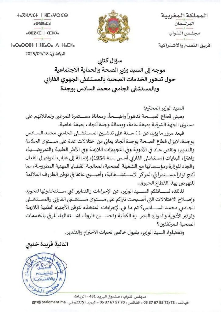 وجهت النائبة البرلمانية فريدة خنيتي عن حزب التقدم والاشتراكية، سؤالا كتابيا الى وزير الصحة والحماية الاجتماعية، بخصوص تدهور الخدمات الصحية بالمستشفى الجهوي الفارابي والمركز الاستشفائي الجامعي محمد السادس بوجدة.