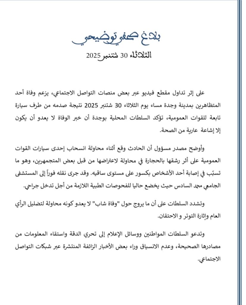 نفت مصادر مسؤولة خبر وفاة أحد المتظاهرين بمدينة وجدة مساء يوم الثلاثاء 30 شتنبر 2025، نتيجة صدمه من طرف سيارة تابعة للقوات العمومية. وتؤكد السلطات المحلية أن خبر وفاة الوفاة مجرد إشاعة عارية من الصحة.