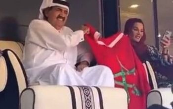 الشيخ حمد بن خليفة آل ثاني وزوجته يرفعان علم المغرب دعمًا لـ”أسود الأطلس” أمام كرواتيا
