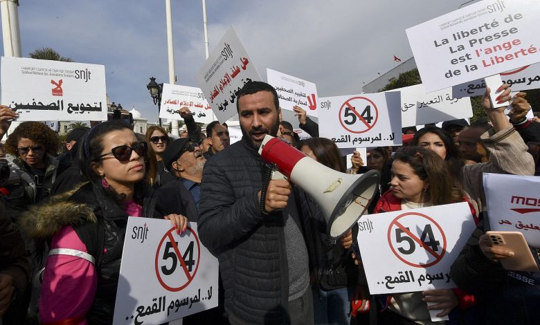 احتج عشرات الصحافيين ونشطاء حقوق الانسان البارحة الخميس في تونس وتظاهروا للتنديد بسياسة الحكومة التي يعتبرونها “قمعية” في محاولة لترويع وسائل الإعلام الخاصة والحكومية وقمع الحريات.