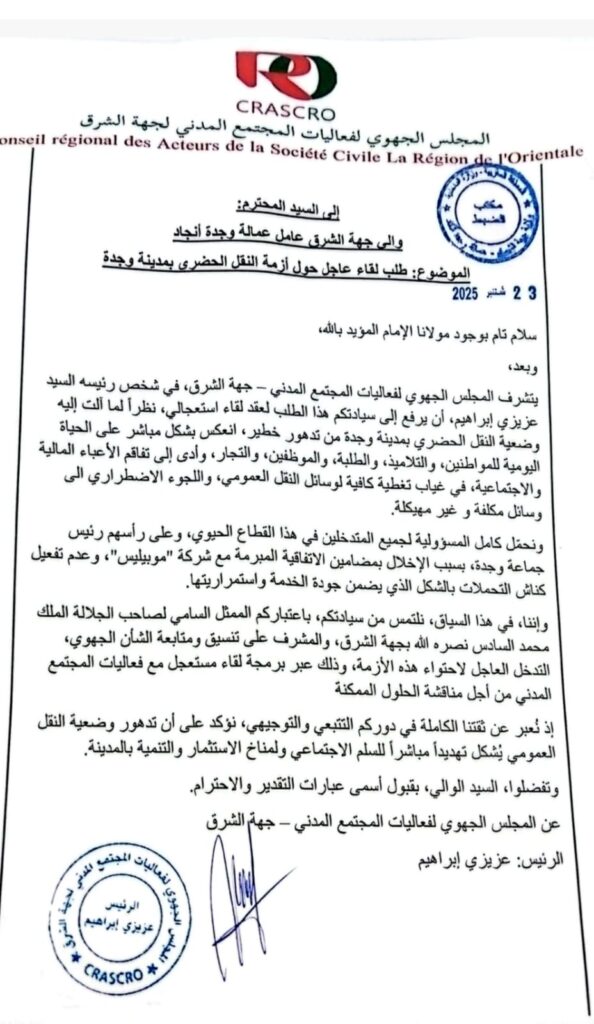 وجه المجلس الجهوي لفعاليات المجتمع المدني لجهة الشرق، في شخص رئيسه إبراهيم عزيزي، مراسلة إلى والي جهة الشرق عامل عمالة وجدة أنجاد بخصوص أزمة النقل الحضري التي تعرفها مدينة وجدة الألفية.