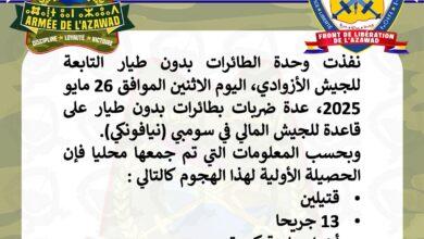 أعلنت جبهة تحرير أزواد عن تنفيذ هجمات استهدفت الجيش المالي باستخدام طائرات بدون طيار، مؤكدة أنها أسفرت عن مقتل جنديين…